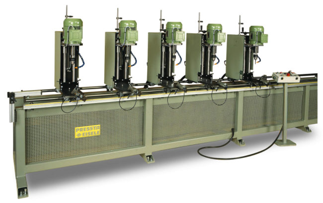Untergestell mit aufmontierten gehärteten Führungen in X- Richtung, Bearbeitungslängen von 3.000 – 8.000 mm. Elektrische Einrichtung – Bedienung über Zwei Hand Sicherheitssteuerung, Einrichtbetrieb für Bohrtiefeneinstellung mit Schlüsselschalter. Laufwagen und Ständer mit Linearführungseinheiten in X- Richtung, Wellenführung für die Bohrkopfhöheneinstellung manuell über Handrad Tiefenanschlag manuell verstellbar, Ausladung max. 125 mm Positionierung in Längsrichtung und Tiefe mit…