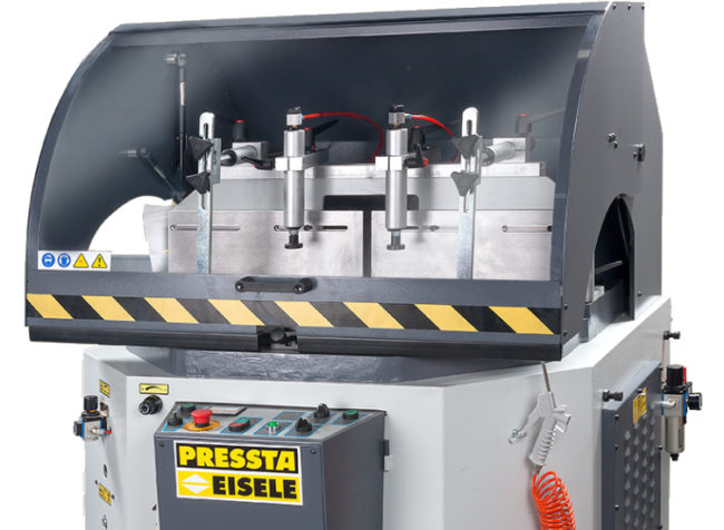 Zum Sägen von Aluminium- und Kunststoffprofilen. Manuelle Handhabung, Sägeschnitt von unten nach oben. Antrieb 2,2 KW, 400 V, 50 Hz. Einsatz von HM-Sägeblättern Ø 350 mm. Manuelle Gehrungseinstellung 30°- 90° – 0° mit Skala. Luftpistole mit Spiralschlauch. Manuelle Schutzhaube (Option pneumatisch). Pneumatische Profilspannung, vertikal mit Spannzylindern. 2 horizontale Spannzylinder (Option). Dosiersprüheinrichtung mit einer Düse, Einsatz…
