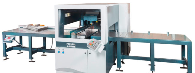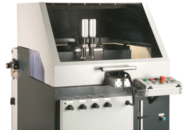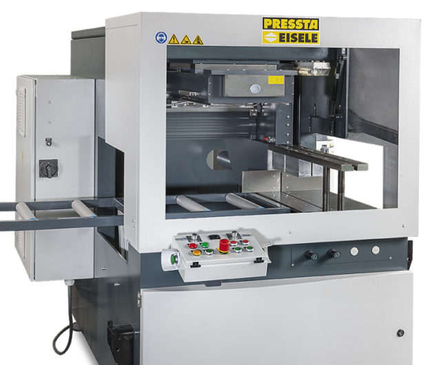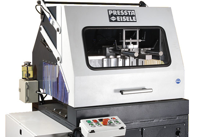 Zum Sägen von Aluminium- und Kunststoffprofilen. Manuelle Handhabung, Sägeschnitt von unten nach oben. Antrieb 2,2 KW, 400 V, 50 Hz. Einsatz von HM-Sägeblättern Ø 350 mm. Manuelle Gehrungseinstellung 30°- 90° – 0° mit Skala. Luftpistole mit Spiralschlauch. Manuelle Schutzhaube (Option pneumatisch). Pneumatische Profilspannung, vertikal mit Spannzylindern. 2 horizontale Spannzylinder (Option). Dosiersprüheinrichtung mit einer Düse, Einsatz…